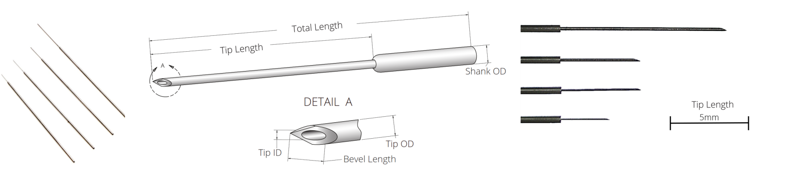 Wymienne igły do iniekcji NanoFil są dostępne z tępymi lub ściętymi końcówkami. Tępe końcówki służą do iniekcji do tkanek miękkich i gdy wymagane jest równomierne rozprowadzenie roztworu. Igły NanoFil ze ściętymi końcówkami są stosowane w aplikacjach wymagających penetracji przez twardą tkankę. Igły NanoFil są dostępne w rozmiarach od 26G do 36G (średnica zewnętrzna od 460 µm do 120 µm).