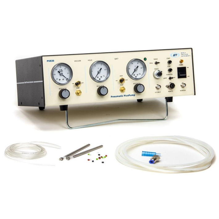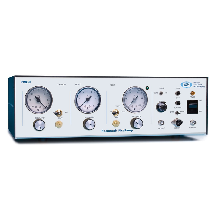 Pompy PicoPump firmy WPI™ wykorzystują precyzyjnie regulowane ciśnienie powietrza do zabezpieczania komórek i wstrzykiwania do nich płynu. Objętości wstrzykiwanego płynu wahają się od pikolitrów do nanolitrów. Oddzielne porty dostarczają ciśnienie dodatnie i ujemne – ciśnienie dodatnie do wyrzutu pod wysokim ciśnieniem oraz ssanie do podtrzymywania komórki lub napełniania pipety od końcówki. Drugi port ciśnieniowy utrzymuje niskie, dodatnie ciśnienie „trzymania” w pipecie wstrzykiwanej pomiędzy impulsami wstrzykiwania, aby zapobiec wchłanianiu płynu przez siły kapilarne lub dyfuzję. Czas, ciśnienie wyrzutu, ciśnienie trzymania i ssanie są regulowane niezależnie za pomocą pokręteł i wskaźników na panelu przednim. Ciśnienie wtrysku jest kontrolowane przez 20-obrotowy regulator na panelu przednim. Wbudowany układ czasowy umożliwia precyzyjną kontrolę czasu, przez jaki ciśnienie wtrysku jest podawane do portu wyjściowego. Przedziały czasowe mogą wynosić od 10 sekund do 10 ms lub mniej, w zależności od ustawienia ciśnienia wyrzutu. Interwał ciśnienia wtrysku można uruchomić ręcznie na panelu przednim, za pomocą przełącznika nożnego lub sterowanego komputerowo impulsu TTL. 5-woltowe wyjście monitora zapewnia impuls logiczny dla komputera lub innego urządzenia monitorującego.