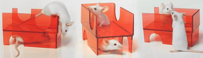 Dwupoziomowa konstrukcja oferuje platformę dla niewymiarowych odsadzeń, aby zwierzę dotarło do źródła pożywienia na pokrywach klatek, a także jest przydatna dla uległych myszy, aby mogły znaleźć schronienie i łatwo oddalić się od dominujących myszy, minimalizując w ten sposób ryzyko obrażeń.