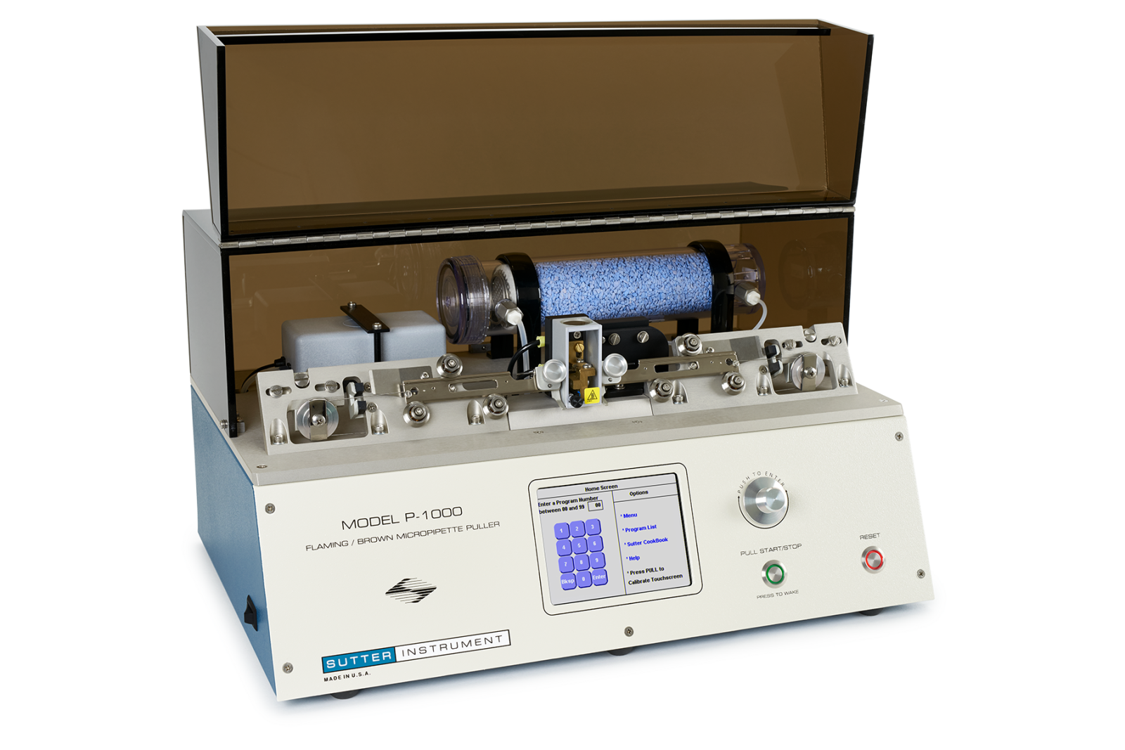 P-1000 to wyciągarka do mikropipet Flaming/Brown nowej generacji firmy Sutter Instrument, wyposażony w kolorowy ekran dotykowy, wbudowany Pipette Cookbook z ponad 100 zaprogramowanymi programami, wstępne podgrzewanie szczęk ThermoLock™, tryb Safe Heat Mode i kompleksową diagnostykę. Ciągnie wszystkie rodzaje szkieł oprócz kwarcu; średnice końcówek 0,06–3 µm.